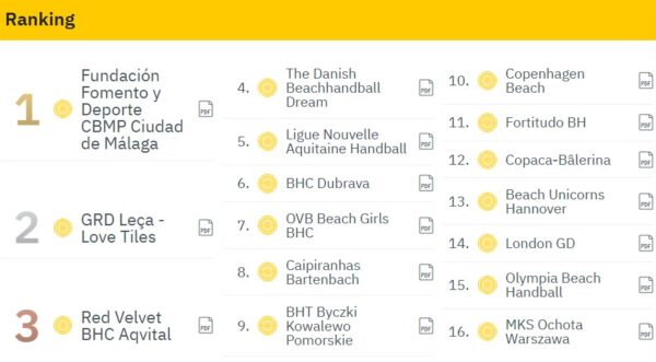 Já no setor feminino, a final foi entre FFD CBMP Ciudad de Málaga e GRD Leça – Love Tiles, com a equipa espanhola a vencer por 2:1 (22:18, 12:13, 4:0) e a tornar-se pela primeira vez Campeã Europeia de clubes de Andebol de Praia.