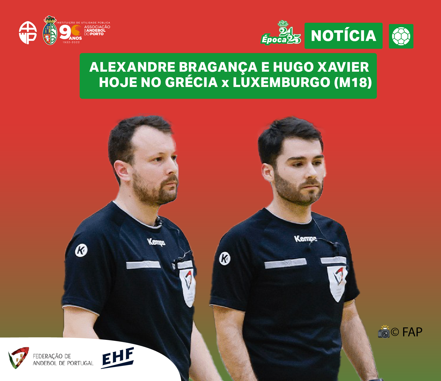 A dupla portuguesa Alexandre Bragança e Hugo Xavier irá arbitrar hoje, às 17h30, no Luxemburgo, o jogo entre Grécia e Luxemburgo, da 1.ª Jornada, do Grupo D, da Fase de Qualificação para o M18 EHF Euro 2026.