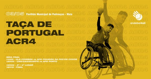 Taça de Portugal de ACR4 Calendário: 03.05.2024 – 11h00 – ULS Coimbra x APD Figueira da Foz/Os Coxos, 0-2 (7-9; 5-22) 03.05.2024 – 12h15 – CNS/Caixiduarte x APD Porto, 0-2 (3-10; 3-11) Apuramento 3.º/4.º 03.05.2024 – 15h00 – CNS/Caixiduarte x ULS Coimbra, 2-1 (12-5; 5-7; 3-2) Final 03.05.2024 – 16h15 – APD Porto x APD Figueira da Foz/Os Coxos, 2-0 (13-5; 13-12)