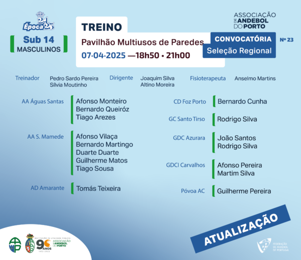 Publicamos assim a atualização dos convocados para o próximo treino da Seleção Regional do Porto, que está agendado para Paredes, para a próxima semana, no Pavilhão Multiusos de Paredes.