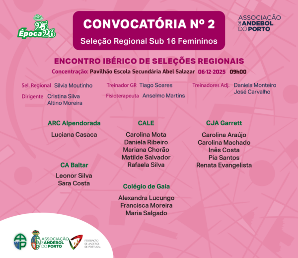 A Seleção de Sub 16 femininos do Porto tem a convocatória Nº 2, com 16 atletas selecionadas, que representarão a AAP, no seu Torneio – Encontro Ibérico de Seleções Regionais Sub 14 e Sub 16, que se realiza em Matosinhos, no próximo sábado e domingo.