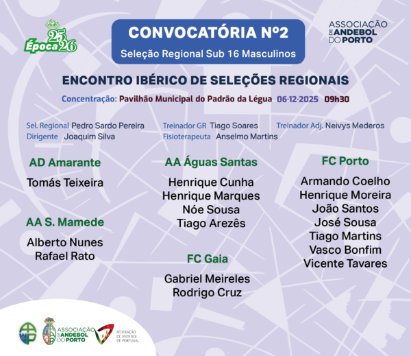 A Convocatória Nº 2 da Seleção Masculina de Sub 16 da Associação de Andebol do Porto (AAP) é referente à sua participação no Torneio da AAP, denominado Encontro Ibérico de Seleções Regionais, para seleções femininas e masculinas de Sub 14 e Sub 16.