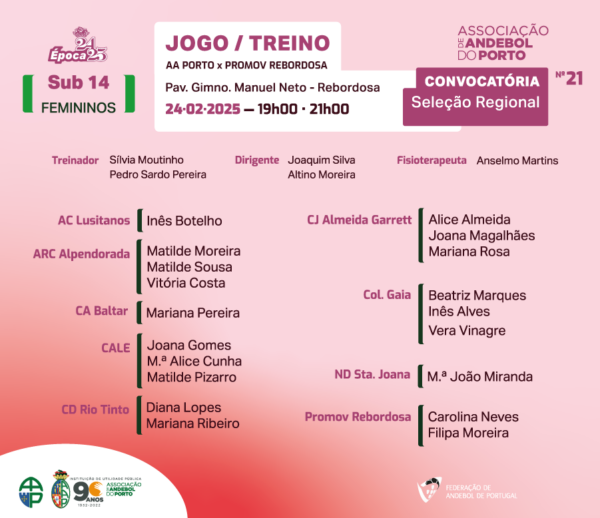 Convocatória Nº 21 TREINO: - SUB 14 FEMININOS - 24 de fevereiro (segunda-feira) 19H00 Pavilhão Gimnodesportivo Manuel Neto (Rebordosa).