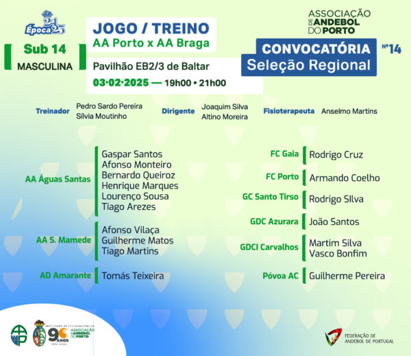 O jogo de treino com a AA Braga terá lugar no Pavilhão da Escola EB 2/3 de Baltar (Paredes), no dia 03 de fevereiro e a Convocatória Nº 14 de Pedro Sardo Pereira apresenta 17 talentos Sub 14 oriundos de 9 clubes.