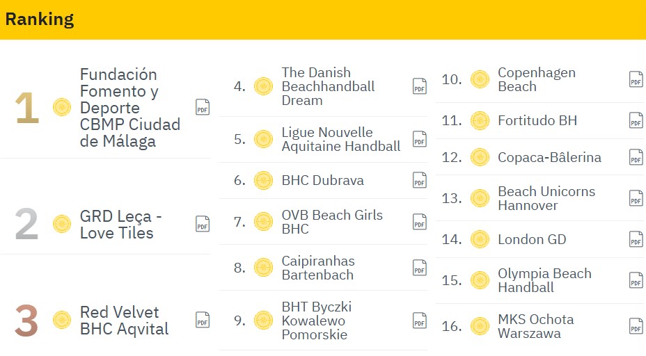 Já no setor feminino, a final foi entre FFD CBMP Ciudad de Málaga e GRD Leça – Love Tiles, com a equipa espanhola a vencer por 2:1 (22:18, 12:13, 4:0) e a tornar-se pela primeira vez Campeã Europeia de clubes de Andebol de Praia.