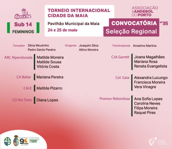 Convocatória da Seleção Regional Feminina de Sub 14 do Porto para o Torneio Internacional Cidade da Maia 2025, para seleções regionais, que se realiza no próximo fim de semana na Maia.