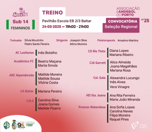 Convocatória Nº 25 TREINO: - SUB 14 FEMININOS - 24 março (segunda-feira) 19H00 Pavilhão Escola EB 2/3 de Baltar (Paredes).