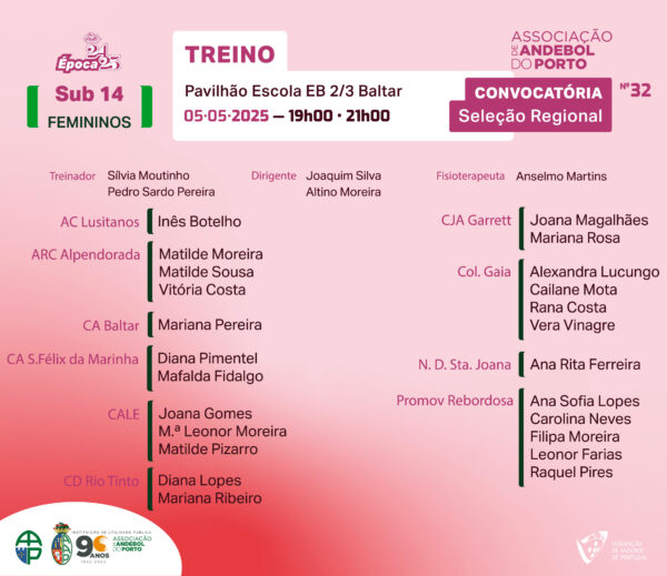 Convocatória Nº 32 TREINO: - SUB 14 FEMININOS - 05 maio (segunda-feira) 19H00 Pavilhão Escola EB 2/3 de Baltar (Paredes).