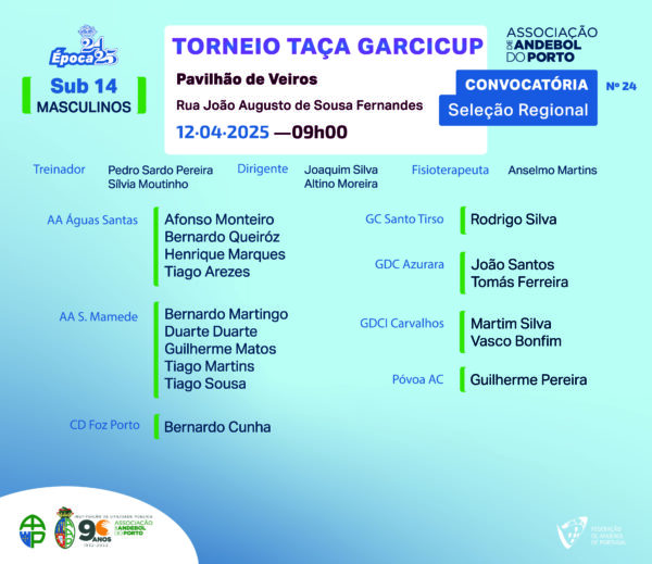 O Torneio “Taça Garcicup“, que vai decorrer este fim de semana em Estarreja vai contar com as seleções regionais do Porto e a Seleção Regional de Sub 14 Masculinos tem já equipa convocada e pronta para mais um torneio.