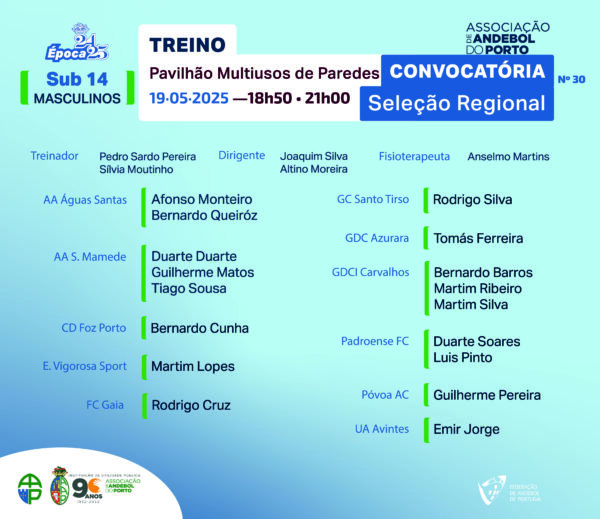 A Convocatória da Seleção de Talentos de Sub 14 Masculinos do Porto para o próximo treino, em Paredes, é mais curta e visa já o Torneio Internacional Cidade da Maia, organizado pela Associação de Andebol do Porto.