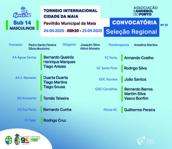 A Seleção do Porto de Sub 14 Masculinos tem já convocatória para o “Torneio Internacional Cidade da Maia”, que se realiza no póximo fim de semana, no Pavilhão Municipal da Maia.