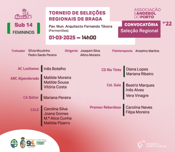 A Seleção de Sub 14 Femininos da Associação de Andebol do Porto tem já convocatória para o Torneio de Seleções Regionais de Braga, que se realiza no próximo fim de semana em Fermentões.