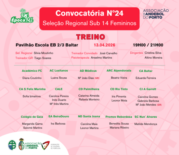 A AAP divulga assim nova convocatória da Seleção Regional Feminina Sub 14, reunindo 24 atletas de 15 clubes, para uma sessão de treino agendada em Baltar, no concelho de Paredes, num momento centrado na observação e desenvolvimento individual das jovens jogadoras.