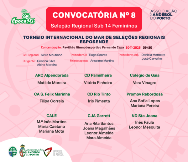 Convocatória da Seleção Feminina de Sub 14 do Porto para o Torneio de Seleções Regionais da Associação de Andebol de Braga, que se realiza em Esposande, no próximo fim de semana.