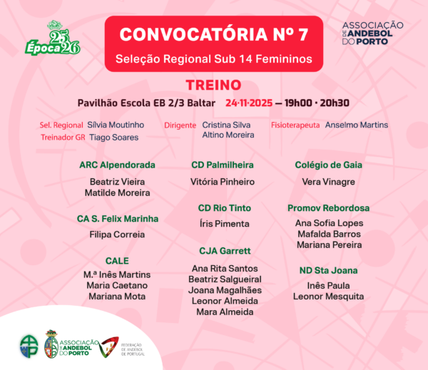 As convocatóras para as seleções regionais do Porto registam, regra geral, um número superior a 20 atletas, mas “para o próximo treino a convocatória foi reduzida para 19 atletas e que será ainda mais reduzida após a sessão de treino, pois serão reveladas as 16 atletas que jogarão o torneio organizado pela Associação de Andebol de Braga”, revela a selecionadora regional feminina.