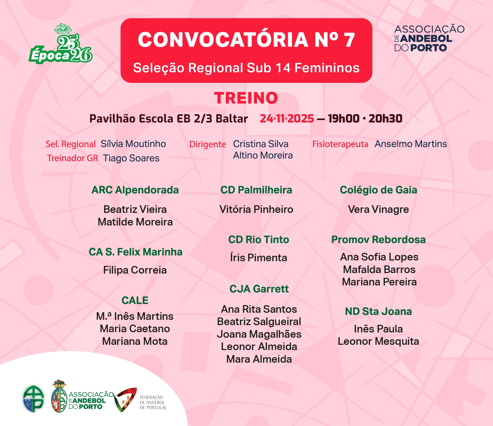 A Seleção Regional de Sub 14 Femininos da Associação de Andebol do Porto (AAP) com convocatória para o seu último treino, antes do próximo torneio, dia 24 de novembro, em Baltar.