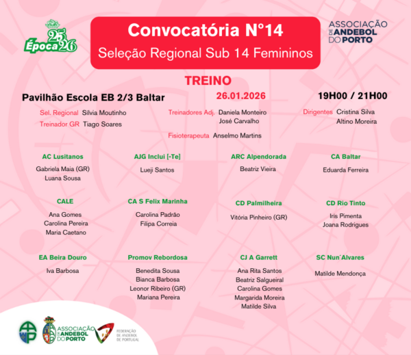 Convocatória nº 14 da Seleção Regional Feminina do Porto de Sub 14, para treino, a realizar na próxima segunda-feira, 26 de janeiro, em Baltar.