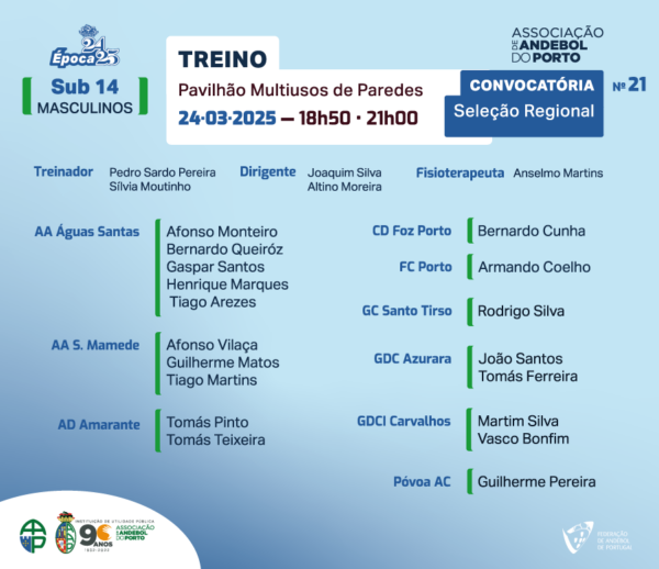 A Convocatória Nº 21 da Seleção Regional masculina de Sub 14 da Associação de Andebol do Porto (AAP) apresenta 18 atletas, de 9 clubes da AAP, para o 17º treino da época 24/25, que decorrerá na próxima segunda-feira, no Pavilhão Multiusos de Paredes.