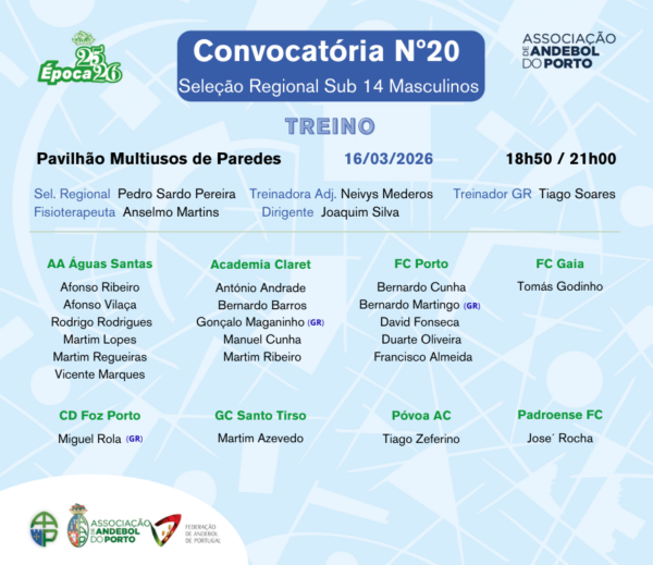 A Associação de Andebol do Porto (AAP) divulga nova convocatória para a Seleção Regional Masculina Sub 14, que treina na próxima segunda-feira, no Multiusos de Paredes.