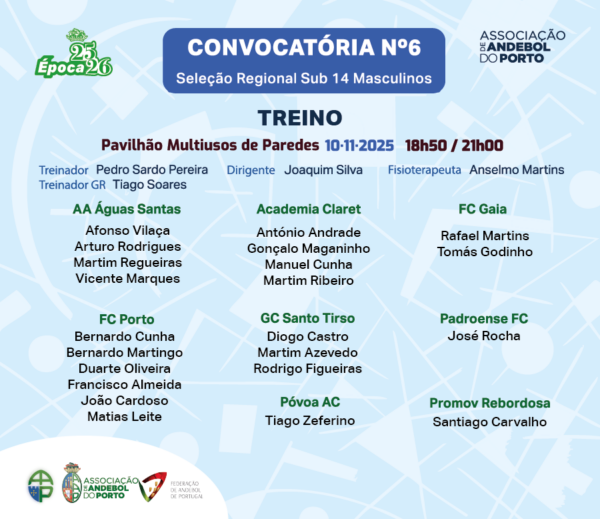 O Selecionador masculino da Associação de Andebol do Porto informa que “voltamos a alargar o grupo com atletas com enorme potencial, já com vista a preparação dos torneios que iremos participar no próximo mês”. Pedro Sardo Pereira tem demonstrado nos últimos tempos satisfação com os trabalhos com esta seleção e confidencia que “os atletas têm disparado de qualidade desde o início do ano e pretendemos ver a sua evolução e escolher os 16 que consideramos estarem mais aptos para competir”.