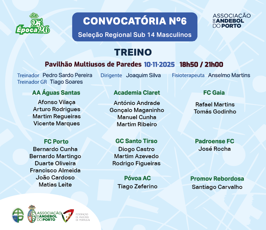 Convocatória Nº6 TREINO: - SUB 14 MASCULINOS - 10 de novembro (segunda-feira) 18H50 Pavilhão Multiusos de Paredes.