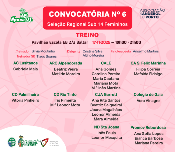 As jovens Sub 14 da AAP vão treinar como é hábito no Pavilhão da Escola EB 2/3 de Baltar, em Paredes, na segunda-feira e são 24 os talentos femininos selecionados pela selecionadora regional e que são provenientes de 10 clubes AAP.