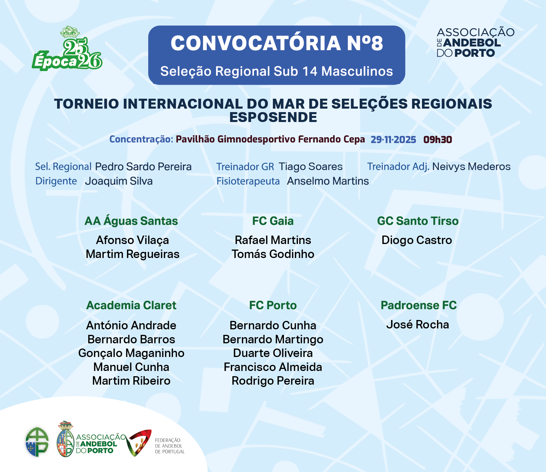Seleção masculina de Sub 14 do Porto já tem convocatória para o Torneio de Esposende, que vai decorrer este fim de semana.