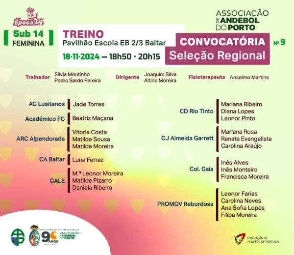 Convocatória nº 9 para as Sub 14 Femininos do Porto com 22 atletas para sessão de treino no próximo dia 18 de novembro, no Pavilhão da Escola EB 2/3 de Baltar, em Paredes.