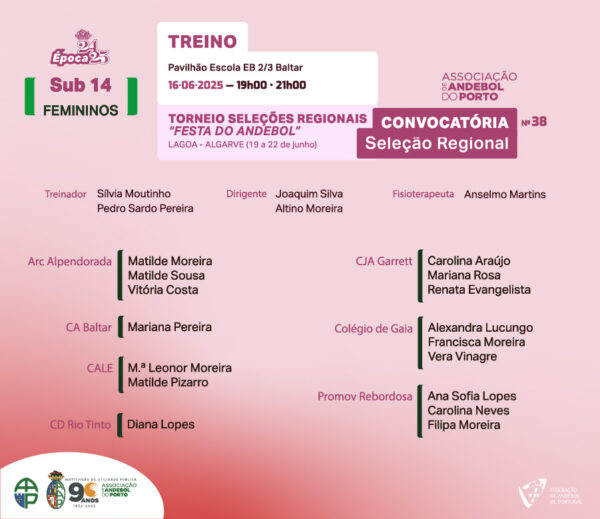 A convocatória nº 38 revela assim as 16 jovens Sub 14 femininos da Seleção Regional da Associação de Andebol do Porto (AAP) selecionadas para o treino da próxima segunda-feira em Baltar e para a Festa do Andebol (Torneio de Seleções Regionais), em Lagoa.