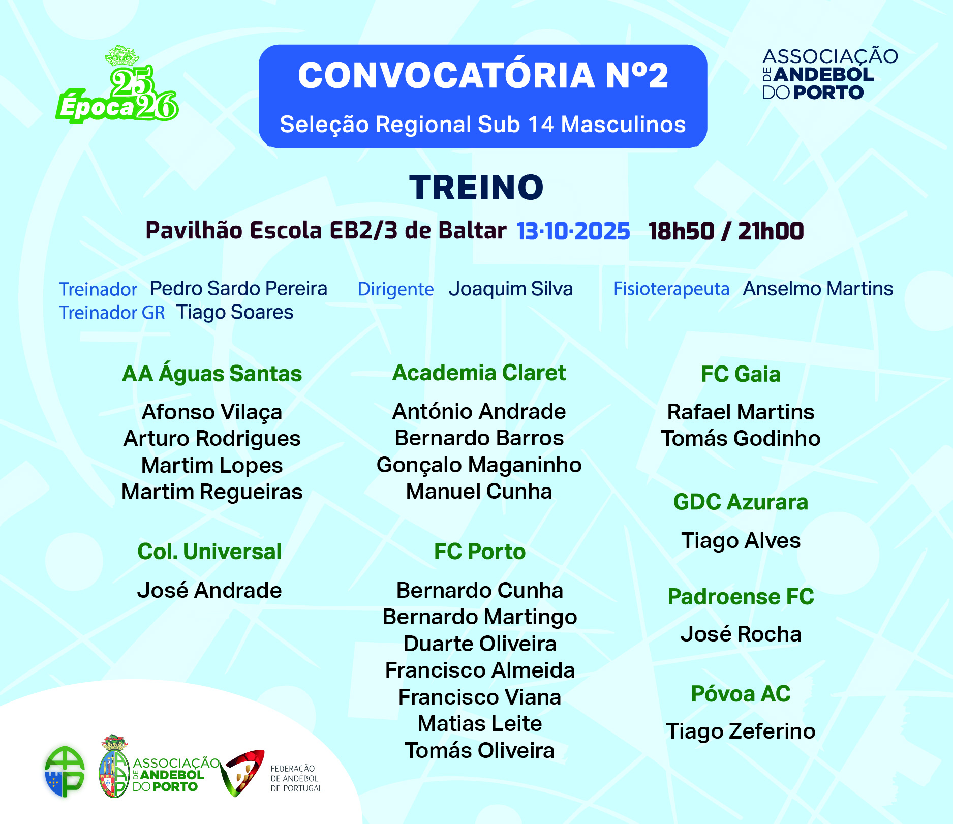 O trabalho das seleções regionais da Associação de Andebol do Porto e Deteção de Talentos Sub 14 continua, mas esta semana somente os masculinos têm treino, que será na próxima segunda-feira, no Pavilhão da Escola EB 2/3 de Baltar, em Paredes.