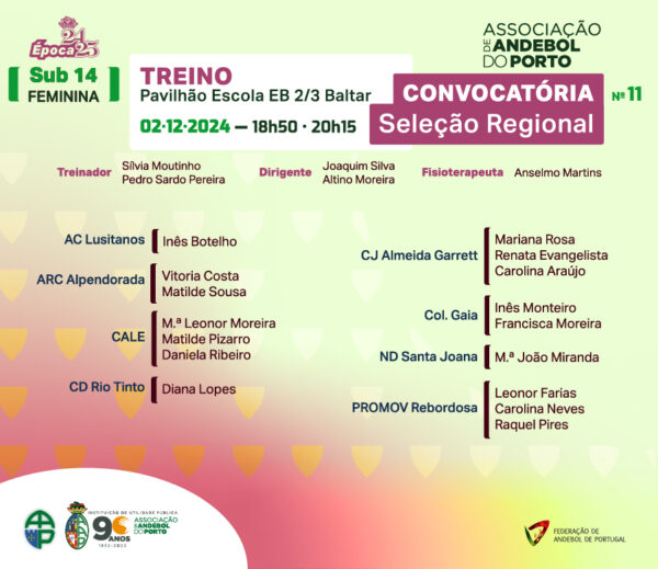 As Sub 14 Femininos da AAP chamadas para o próximo treino são prevenientes de 8 clubes e são 17 jovens talentos; que reflete uma Convocatória Nº11 já a pensar na próxima competição que esta Seleção Regional vai participar.