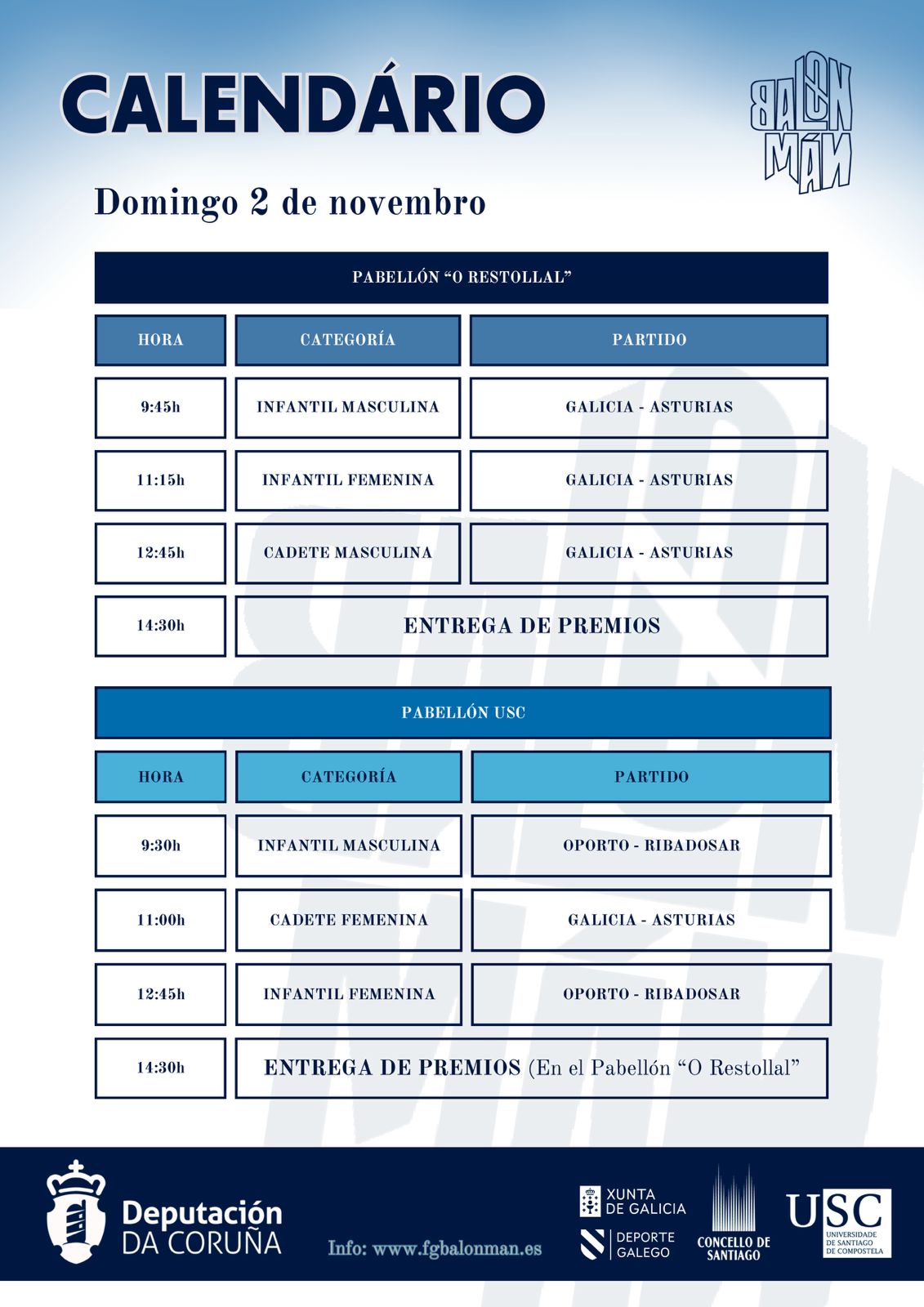 RESULTADOS: 01 DE NOVEMBRO (sábado) 12H00 | F. Galega B. x AAP | Sub 14 Femininos | 31 - 17 | 13H30 | AAP x Fed. Astúrias | Sub 14 Masculinos | 31 - 30 | 19H00 | F. Galega B. x AAP | Sub 14 Masculinos | 36 - 26 | 20H30 | AAP x Fed. Astúrias | Sub 14 Femininos | 8 - 31 | 02 DE NOVEMBRO (domingo) 09H30 | AAP x BM Ribadosar | Sub 14 Masculinos | 25 - 19 | 12H45 | AAP x BM Ribadosar | Sub 14 Femininos | 26 - 9 |