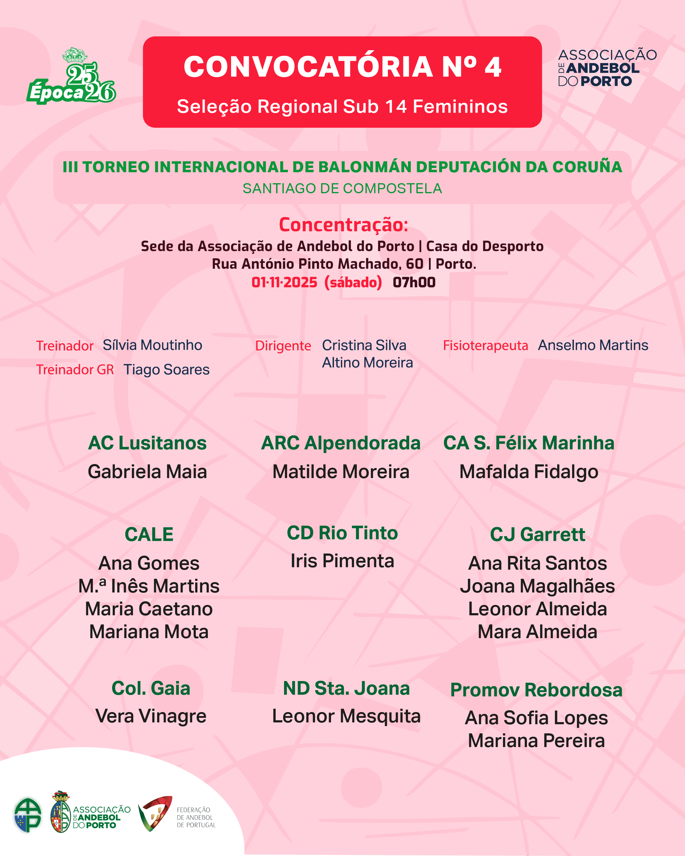 As seleções regionais de Sub 14 masculinos e femininos da Associação de Andebol do Porto (AAP) vão participar no próximo fim de semana, em Santiago de Compostela, no Torneio Internacional da Federación Galega de Balonmán (FGB).