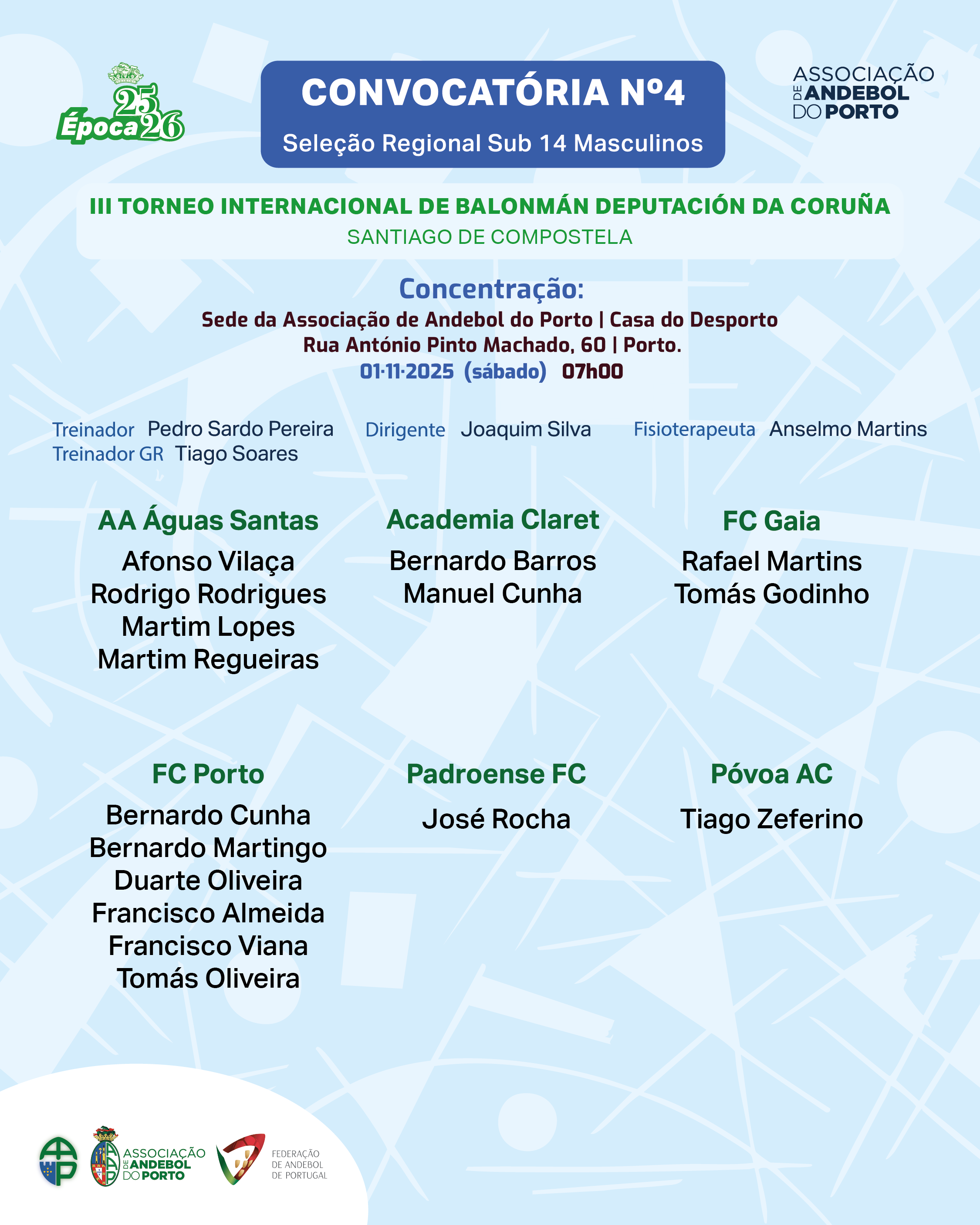 O torneio é num formato triangular, todos contra todos e terá lugar em Santiago de Compostela, Corunha, Galiza, no Pavilhão O Restollal e no Pavilhão USC e terá a participação das seleções Sub 14 (Infantis): da Federación Galega de Balonmán, Federación Balonmano Principado de Asturias, Associação de Andebol do Porto. A Seleção do Porto defrontará ainda no domingo (02 de nov.) num terceiro jogo, a equipa Sub 14 do Club Balonmán Ribadosar, que é de Santiago de Compostela.
