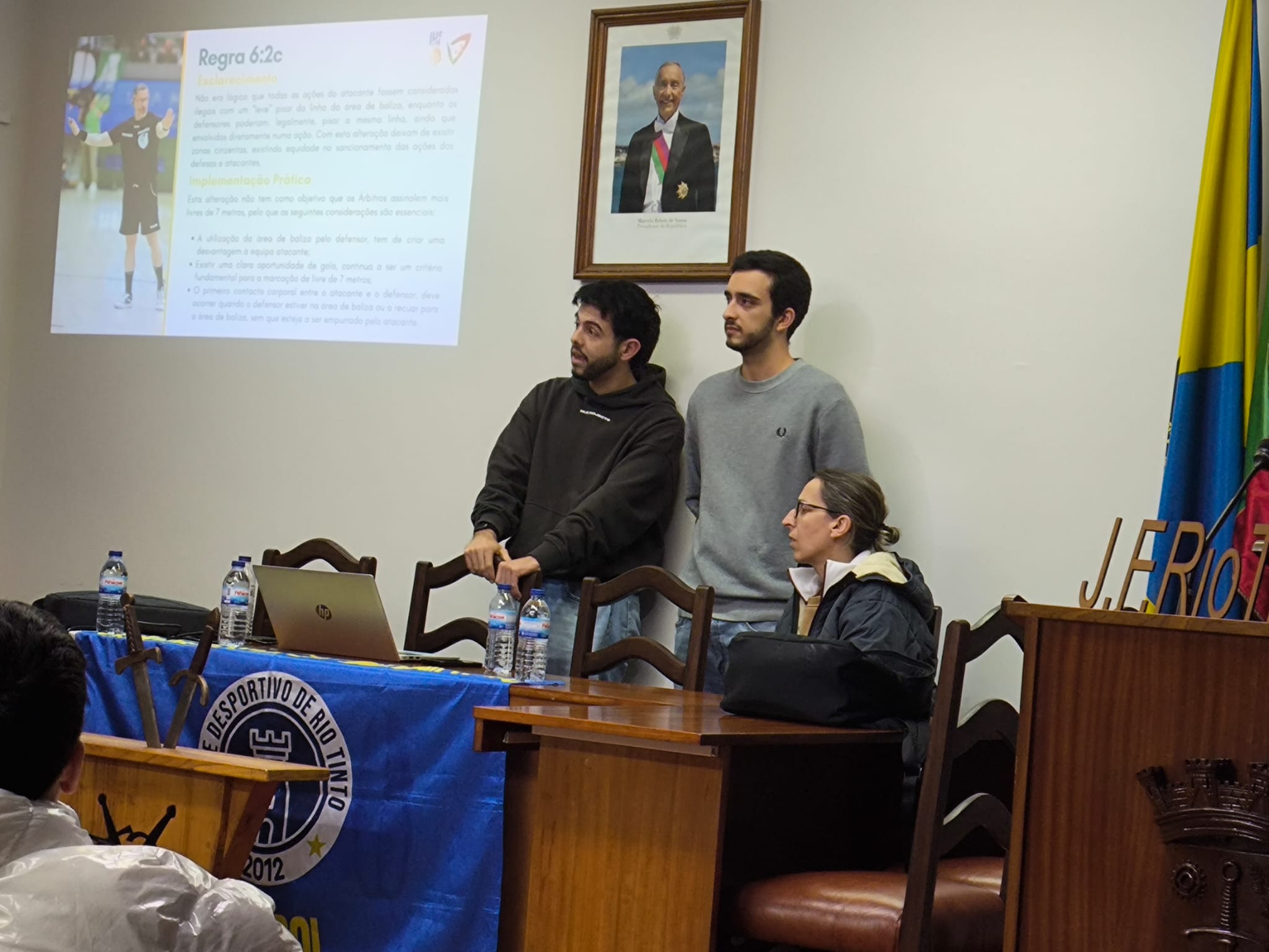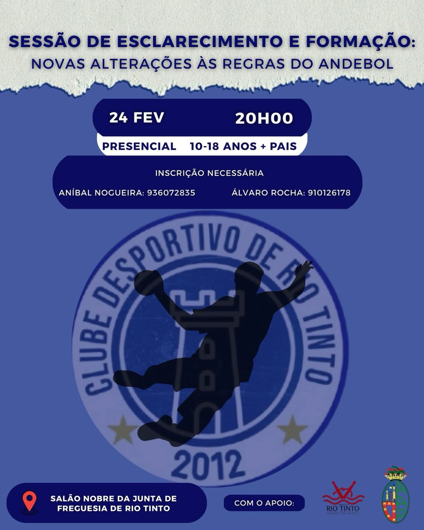 O Salão Nobre da Junta de Freguesia de Rio Tinto recebeu esta importante, útil e esclarecedora Sessão de Esclarecimento e Formação, que foi organizada pelo Clube Desportivo Rio Tinto, presidida pelo Dr. Paulo Ferreira, Presidente do clube de Gondomar, coordenação de Anibal Nogueira, dirigente Coordenador do Andebol masculino e a presença e condução desta sessão pelo Departamento de Arbitragem da Associação de Andebol do Porto (AAP) pelos árbitros: Betina Martins, Gonçalo Santos e Tomás Caldeira
