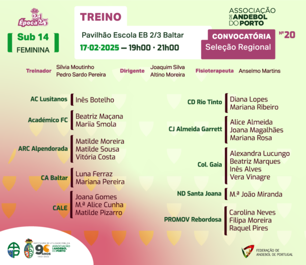 As Sub 14 Femininos da Associação de Andebol do Porto voltam aos treinos com a Convocatória Nº 20 alargada a 24 atletas, para a sessão marcada para a próxima segunda-feira, em Paredes.