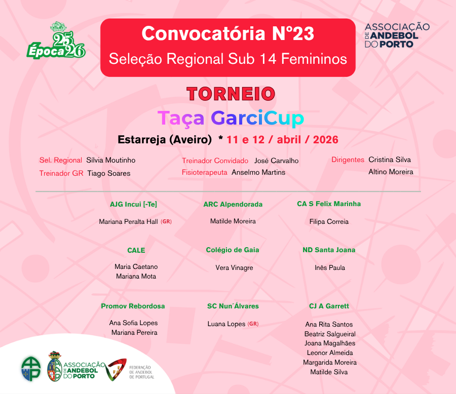 A Seleção Feminina do Porto irá participar novamente na cidade de Estarreja, distrito de Aveiro, na Taça GarciCup 2026, um excelente torneio organizado pela Assocação de Andebol de Aveiro e em que participam várias seleções regionais femininas e masculinas Sub 14, de várias regiões nacionais: Aveiro, Leiria, Algarve, Viseu e Porto.