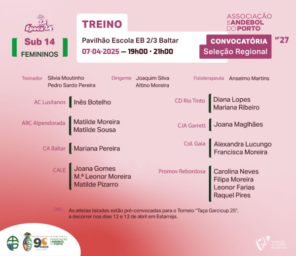 As Sub 14 da Associação de Andebol do Porto (AAP) têm uma convocatória mais reduzida para o próximo treino, onde constam 16 atletas, que representam 8 clubes: AC Lusitanos, ARC Alpendurada, CAB, CALE, CD Rio Tinto, CJ Almeida Garrett, Colégio de Gaia e PROMOV Rebordosa, naquele que será o último treino antes da próxima competição – Taça Garcicup, nos dias 12 e 13 de abril, em Estarreja.