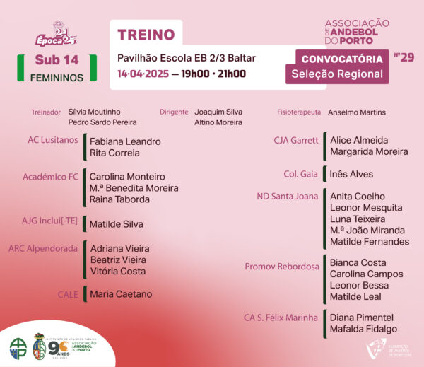 As jovens Sub 14 da Associação de Andebol do Porto treinam assim na próxima semana às ordens de Silvia Moutinho, num novo grupo constituído por 24 atletas de 9 clubes, em que metade já participou em pelo menos um treino da seleção regional e a outra metade são novas atletas referenciadas pelos respetivos treinadores. Um grupo com atletas maioritariamente nascidas em 2012.