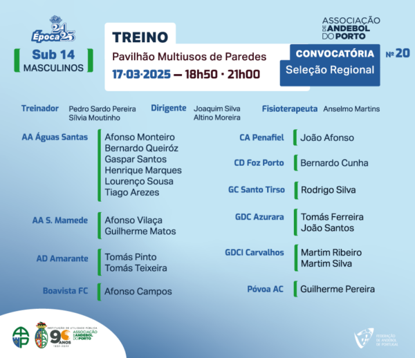 São 19 nomes que constam nesta última convocatória, com atletas representantes de 10 clubes, que como é habitual, continuarão na próxima segunda-feira, em Paredes, o trabalho com os jovens talentos Sub 14 do Porto e da Seleção Regional deste escalão.