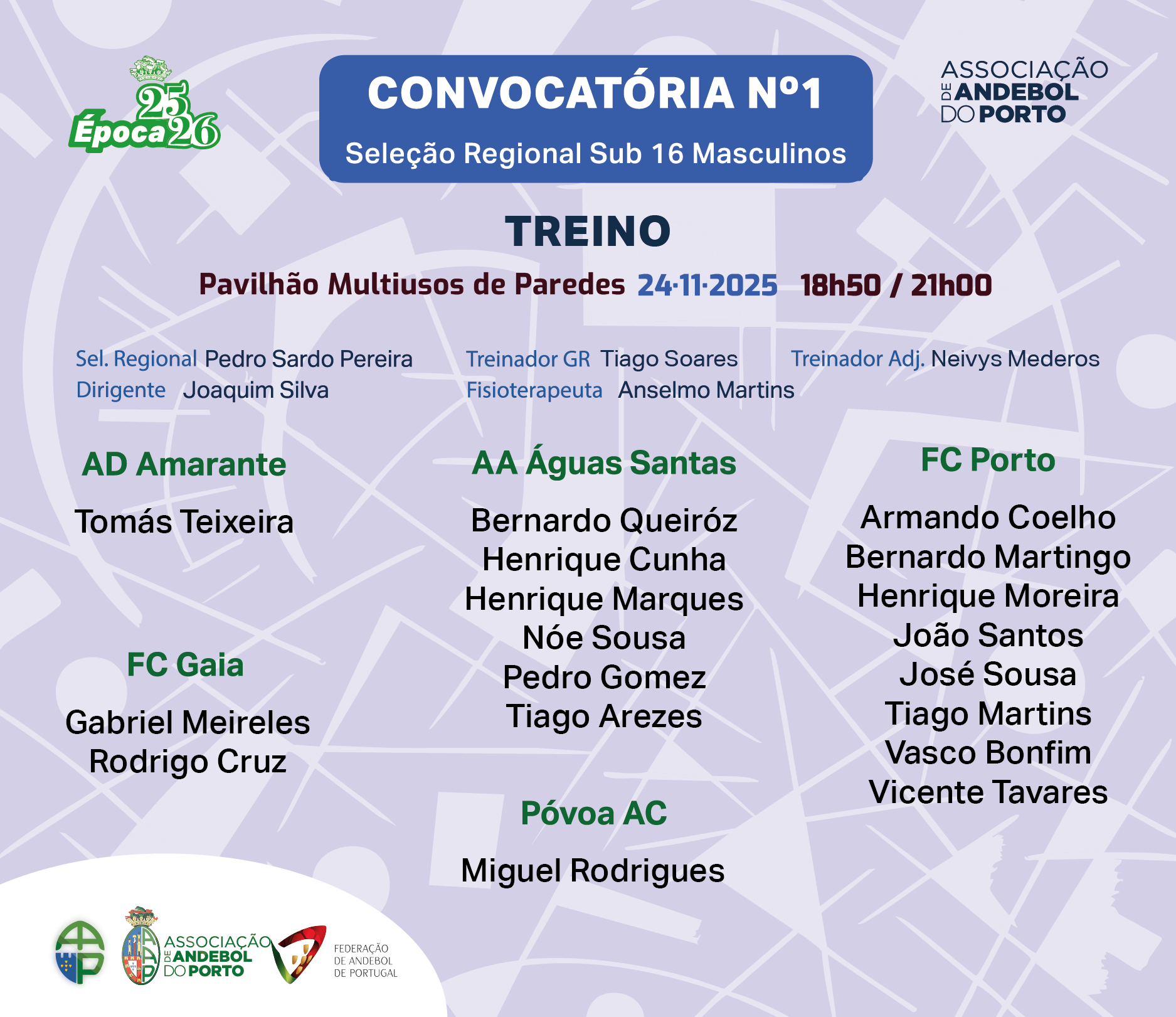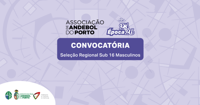 A Seleção masculina de Sub 16 tem a sua primeira convocatória de 25/26, com 16 atletas e 5 clubes representados, para treino, no Pavilhão Multiusos de Paredes, na próxima segunda-feira e o motivo é a participação no Torneio Internacional da Associação de Andebol do Porto (AAP), denominado Encontro Ibérico, para Seleções Regionais, femininas e masculinas de Sub 14 e Sub 16.