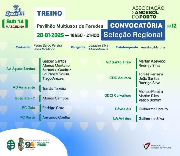 A convocatória nº 12 da Seleção de Talentos Sub 14 Masculinos apresenta 19 atletas, de 10 clubes diferentes, sendo esta chamada do Selecionador Regional mais um momento de observação de jovens atletas que têm vindo a destacar-se nos seus clubes.