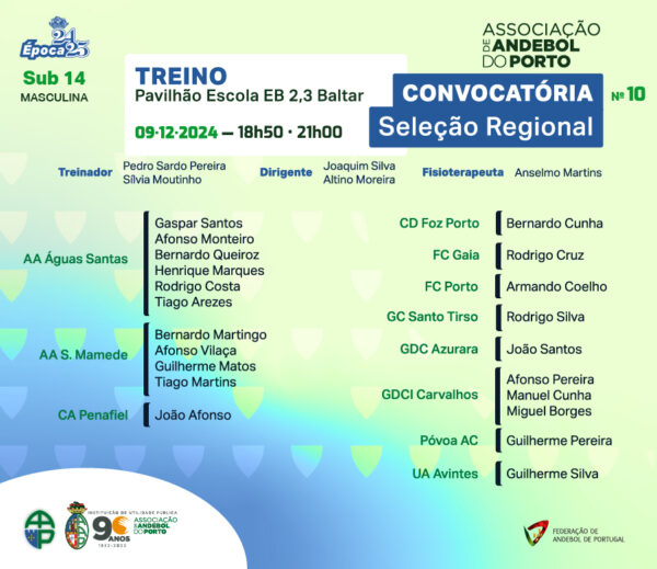 A Convocatória nº 10 da Seleção de Talentos Masculinos de Sub 14 apresenta 21 atletas representantes de 11 clubes e tem como objetivo a observação em treino de novos atletas com potencial, bem como continuar o trbalho com alguns dos atletas que participarão este fim de semana no Torneio Internacional – Deputación da Coruna, que se realiza em Santiago de Compostela, Espanha.
